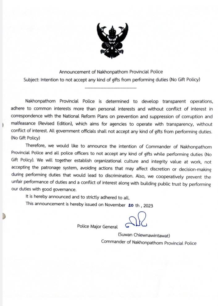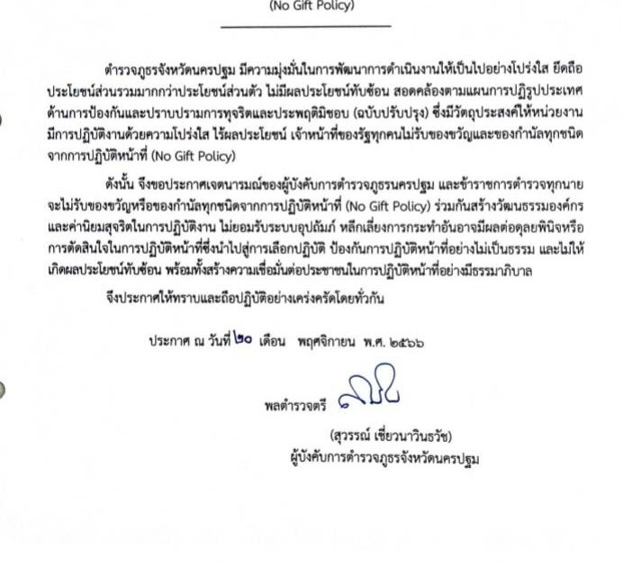 ประกาศไม่รับของขวัญ No Gift Policy 27 มีนาคม 2567 โดย adm_nakhonpathom adm_nakhonpathom / ข่าวกิจกรรม,ข่าวประกาศและคำสั่ง,ข่าวประชาสัมพันธ์,ข่าวภารกิจผู้บังคับบัญชา,ไม่มี
