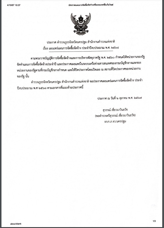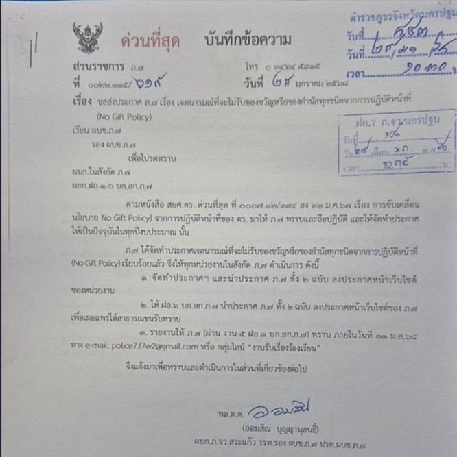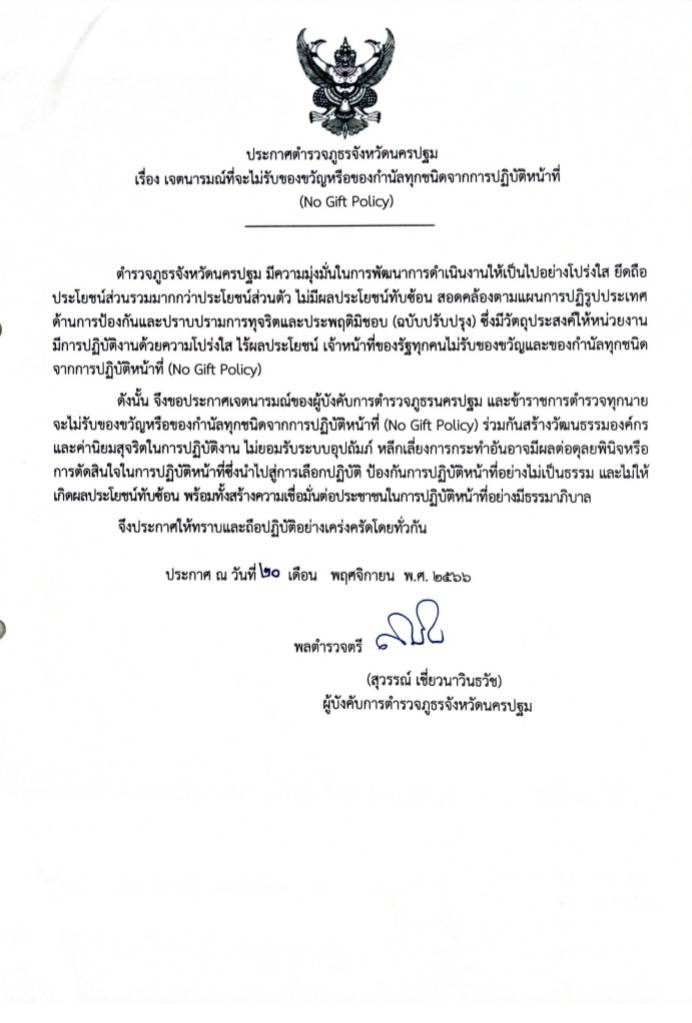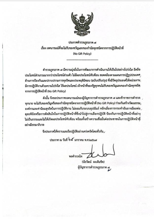 - ประกาศสำนักงานยุทธศาสตร์ตำรวจเรื่องเจตนารมณ์ที่จะไม่รับของขวัญหรือของกำนัลทุกชนิดจากการปฏิบัติหน้าที่